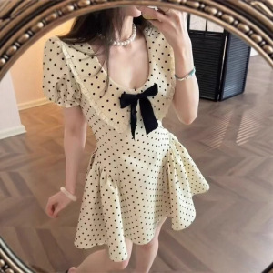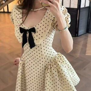 フレンチスタイルのリボン半袖水玉ドレス女性のための夏の新しいウエスト痩身美しいAラインスカート