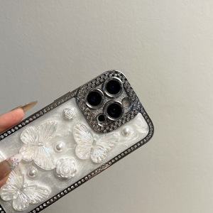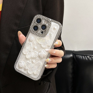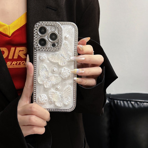 Apple 15PROMAX 携帯電話ケース ラインストーン接着剤立体パールバタフライ Apple 16 電気メッキ保護カバー 14 に適しています。