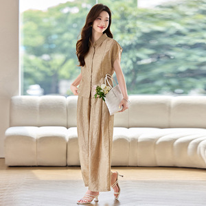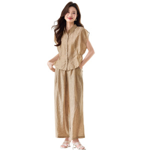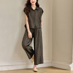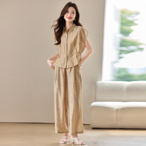 女性のためのハイエンドでスタイリッシュな年齢軽減スーツ 2025 夏の新しいスリムなトップスとワイドレッグパンツのツーピースのトレンディなセット