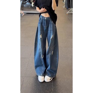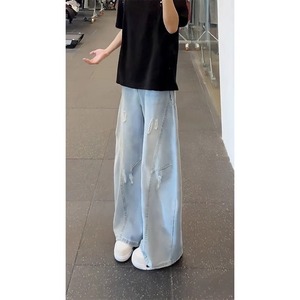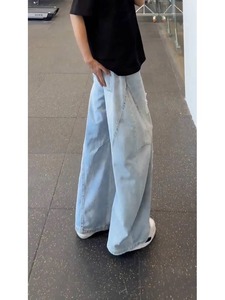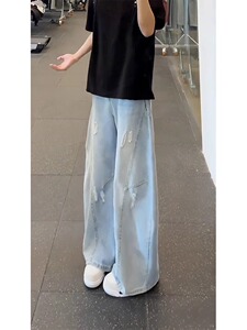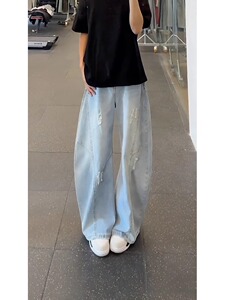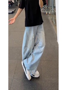 浅蓝色破洞阔腿牛仔裤男夏季美式高街痞帅裤子时尚直筒微喇弯刀裤