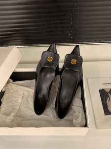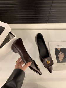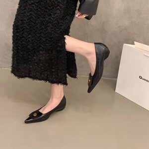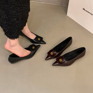 太いヒールとポインテッドトゥのフレンチスタイルの女性用シングルシューズ2025春新作気質浅い口黒通勤シューズ