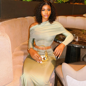 ヨーロッパとアメリカンスタイルのクロスボーダーファッションへそ出し無地プリーツスカートスーツワンショルダー斜め襟長袖ツーピースセット気質レディースファッション