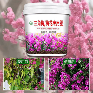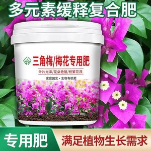 三角フラワー専用肥料、開花促進・根強化粒状緩効性栄養肥料、新緑の葉と梅の花の有機肥料