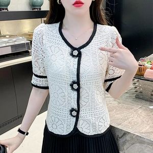 ファッショナブルな襟シフォンシャツ女性の半袖 2025 夏の新デザインかぎ針編み中空老化防止レースシャツ