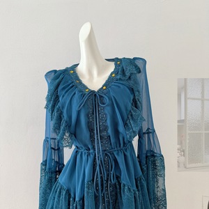 2025年リアルショット夏長袖ピーコックブルーレースドールシフォンシャツVネックライト大人風トップススカート