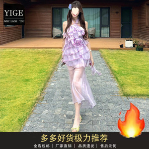 2025 新しい夏のスタイルフレンチフリルメッシュホルターネックドレス女性の海辺の休暇美しい不規則なロングスカート