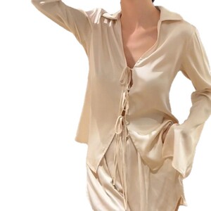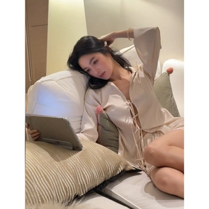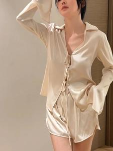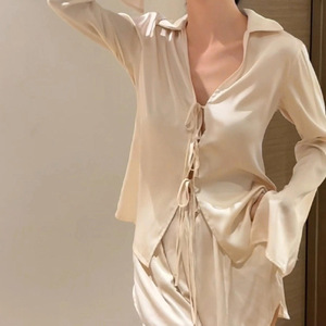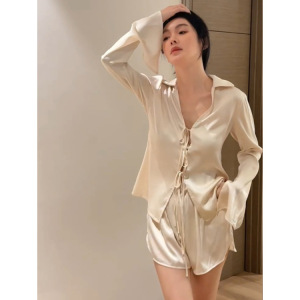 ファッショナブルでハイエンドのアイスシルクサテン長袖パジャマ女性用夏薄い大きいサイズ快適で肌に優しいホームウェアセット
