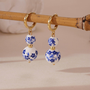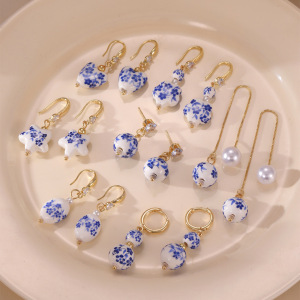 レトロな青と白の磁器イヤリング新しい中国風の愛五芒星セラミックイヤリング女性のためのステンレス鋼クロスボーダーホット販売卸売