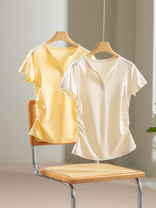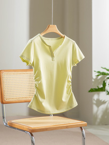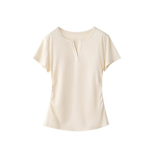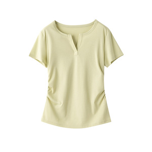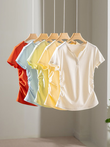 女性用右肩ハーフオープンカラースリムウエストTシャツ25夏新作不規則プリーツウエストデザインベーシックインナートップ