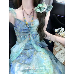海边度假风印花小飞袖吊带连衣裙女2025夏季新款收腰仙女长裙子