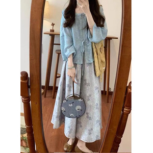 新しい中国風のリラックスしたファッションブルートップスとスカートツーピーススーツ女性のための 2025 夏の新スタイル