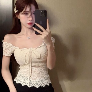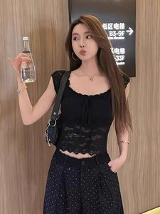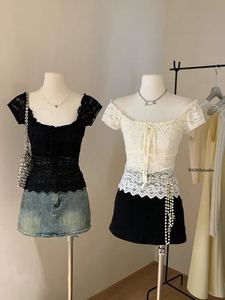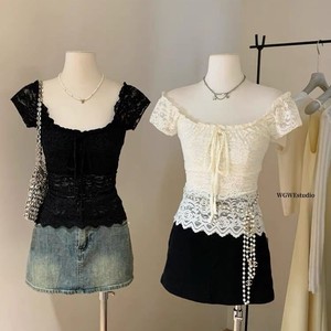 1922 # フレンチレトロレースかぎ針編みリボンスクエアネック半袖Tシャツレディースサマーウエスト痩身トップトレンディ