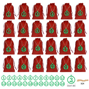 バーガンディバッグ+グリーンタグ; 7*9cm (布バッグ1枚のサイズ); クリスマスセット[バッグ24枚+タグ24枚+麻縄24本]
