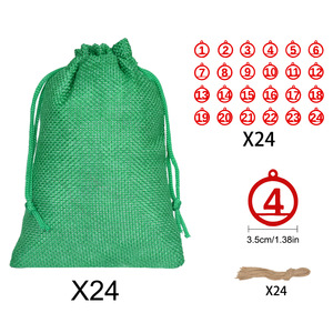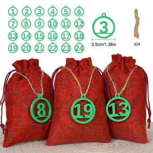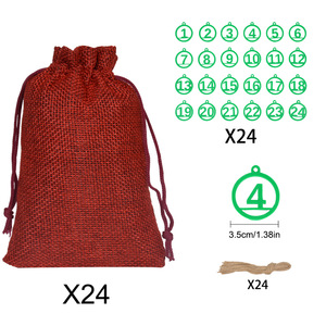 バーガンディバッグ+グリーンタグ; 17*23cm (布バッグ1枚のサイズ); クリスマスセット[バッグ24枚+タグ24枚+麻縄24本]