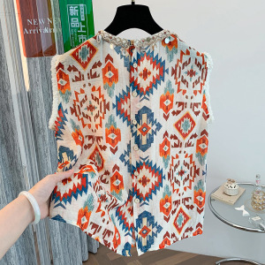 デザインされたラウンドネックフライングスリーブビーズプリントベストシャツ女性の夏の新しいファッションスリムカジュアルチョッキトップ