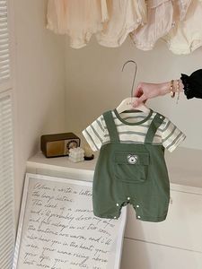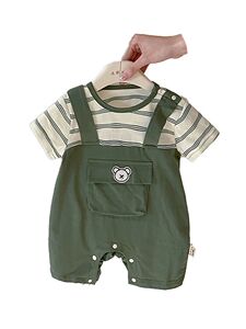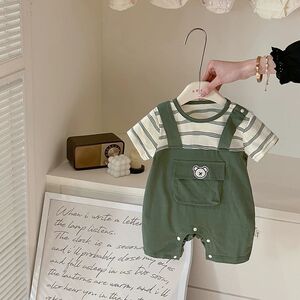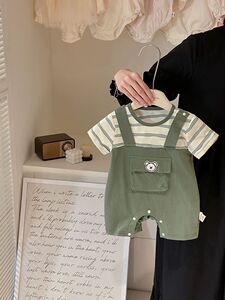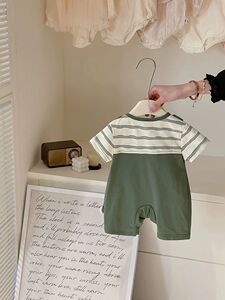幼児半袖ジャンプスーツ、夏休みツーピース薄手夏ロンパース、満月百日ストライプカジュアルロンパース