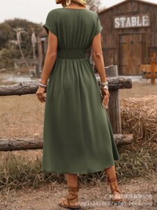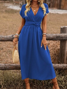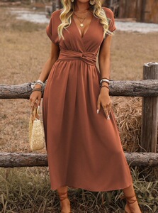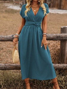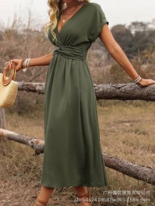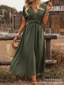 レディースヨーロッパとアメリカのクロスボーダーVネックプリーツソリッドカラーウエストツイスト痩身ドレス