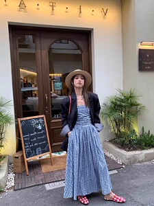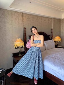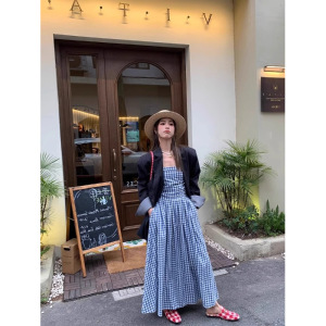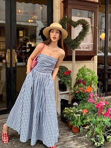チェック柄チューブトップワンピース、女性用ワンショルダードレス、夏のフレンチスタイルデザイン、ウエストを細くする海辺の休暇ロングスカート