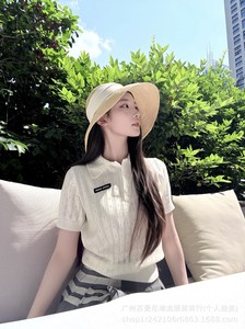 ミウ系先輩の透かし編みニット、元英風の小さなポロ襟デザイン、縦縞ジャカード半袖、アイスシルク素材で通気性があり快適です。