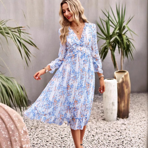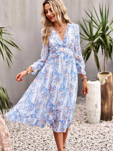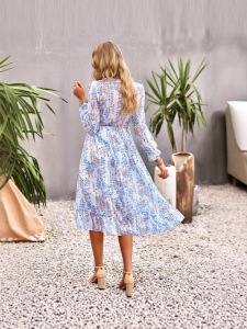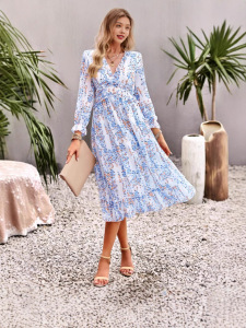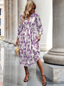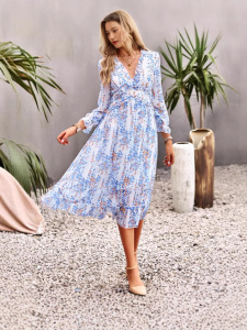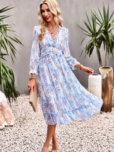 クロスボーダー 2025 ヨーロッパとアメリカの春と秋の新プリント長袖 V ネックドレス INS カジュアルルーズパーティードレス