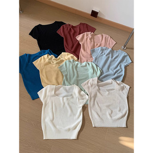 夏スクエアネッククラインブルー半袖セーター婦人服韓国風ショートアイスシルクボトムシャツ西洋スタイル痩身トップ
