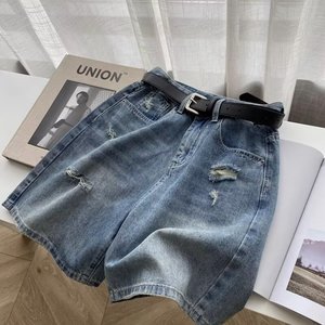 女性用リップドデニムショートパンツ2025春夏新作ファットガールスリムストレートミッドパンツハイウエスト5点ホットパンツ