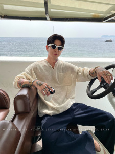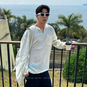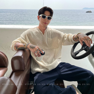 OXFREAK「テンセルリネン軽量」オールドマネースタイルニットVネック長袖Tシャツメンズルーズボトムストップス