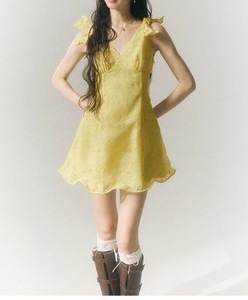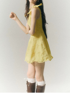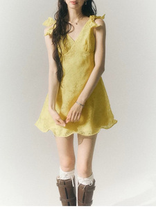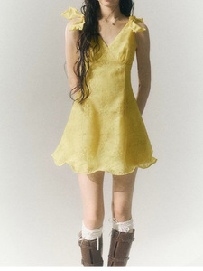 SereneEase フレンチレトロ V ネックサスペンダードレス気質ウエスト痩身イエローフラワーレースベストスカート