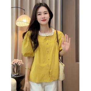 2025 夏の新スタイルレースステッチ多用途ソリッドカラールーズカジュアルスリムラウンドネックパフスリーブシャツ女性のための