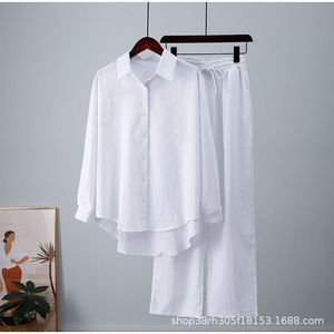 Amazonクロスボーダー春秋大きいサイズゆったり気質カジュアル綿麻無地シャツワイドレッグパンツスポーツスーツ