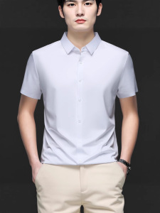 夏の新無地シームレス半袖シャツ弾性シルキー若者紳士服薄型スリム半袖シャツ男性用
