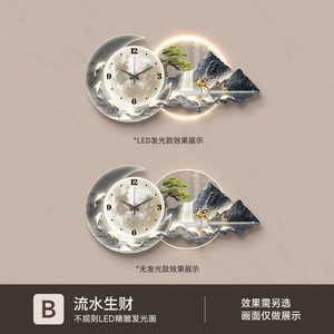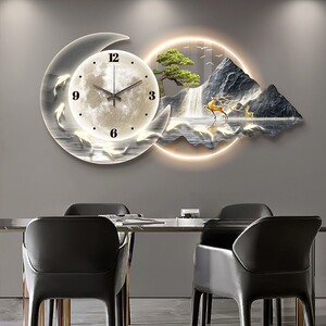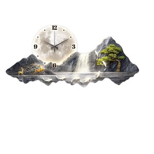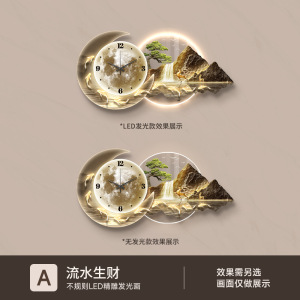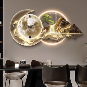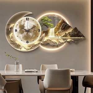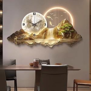 日照金山带钟表挂墙餐厅装饰画创意挂钟饭厅餐桌时钟轻奢客厅挂画