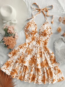 ヨーロッパとアメリカのクロスボーダーレディースホリデースタイルレトロ青と白の水彩ローズプリントネックラインフリル装飾ドレス