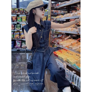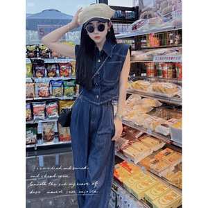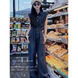 韓国風カジュアルファッションデニムスーツレディース夏新スタイルレトロノースリーブシャツストレートワイドレッグパンツ2点セット