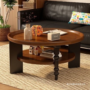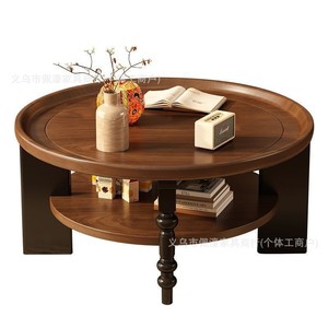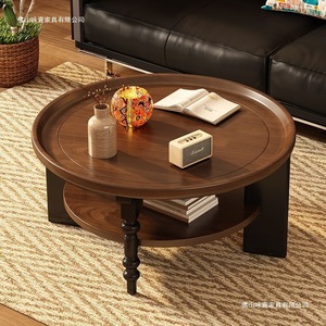 フレンチレトロ無垢材コーヒーテーブルリビングルームホーム小さなアパートラウンド二層ウォールナット色のローティーテーブル中古家具