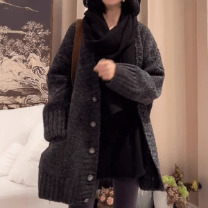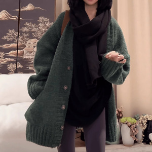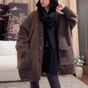 ヨーロッパレトロスタイルルーズレイジーセータージャケットレディース秋冬新作厚みのある大きいサイズニットカーディガントップ