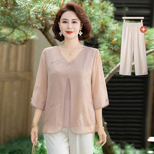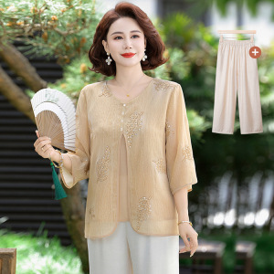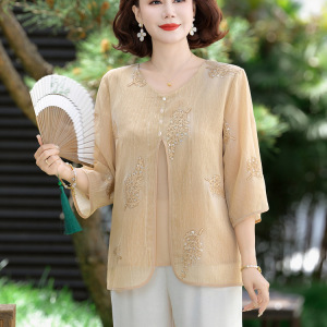 中年妈妈洋气衬衫夏装新款七分袖上衣中老年夏季时尚国风套装女衣