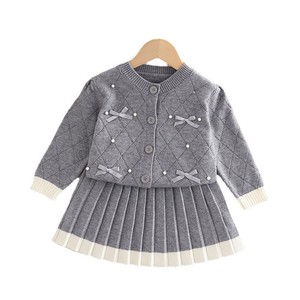 ガールズカレッジスタイルスカートスーツ2025秋冬新作トップス+スカート子供用リボンニット2点セット
