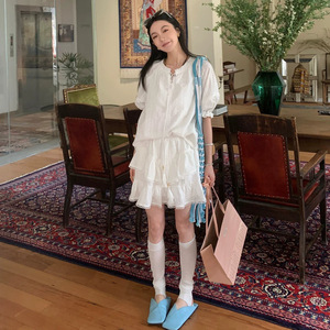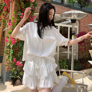 スポットコットン刺繍半袖シャツトップスとスカートスーツ女性用2025リラックスホワイト2点セット