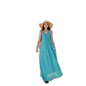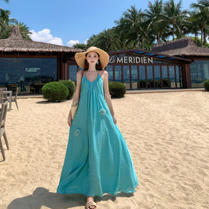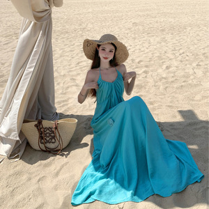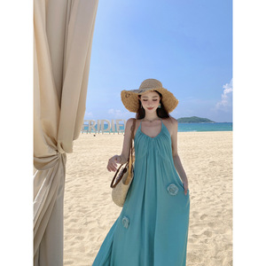 2025 ブルーフラワーリゾートスタイルホルターネックドレス優しく甘い妖精ハイエンド気質ビーチドレス