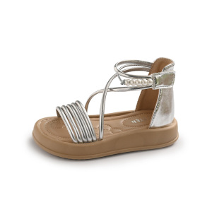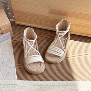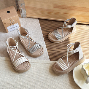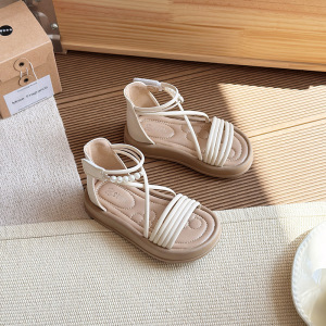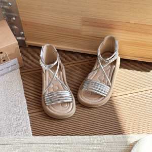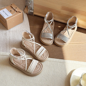 ガールズサンダルプリンセスシューズ2025夏の新しいスタイル多用途織りクロスストラップハイトップソフトソールローマンサンダル