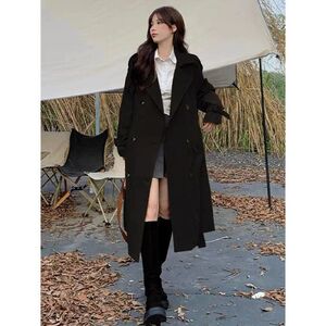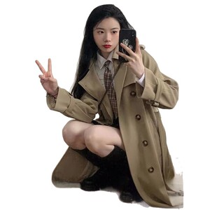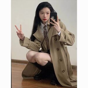 カーキトレンチコートレディースミドル丈春秋新作英国風学生トレンチコートレディース小柄コートトレンド
