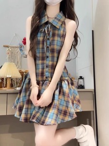 フレンチカレッジスタイルブルーチェック柄ドレス女性のための夏の2025新しい気質ホットガールウエストショートスカートスーツ