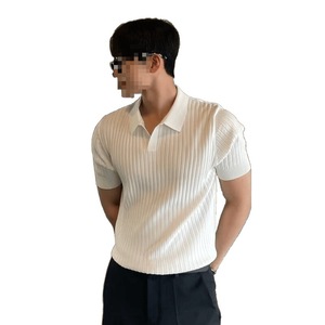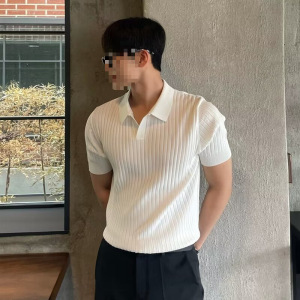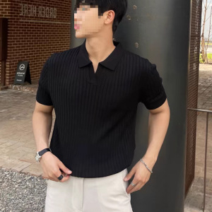 夏ストライプ半袖ポロモミメンズ韓国風スリムラペル無地カジュアル薄手半袖トレンディニットトップ