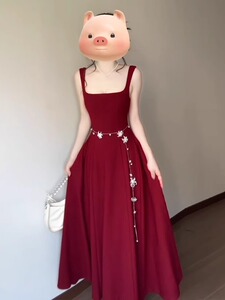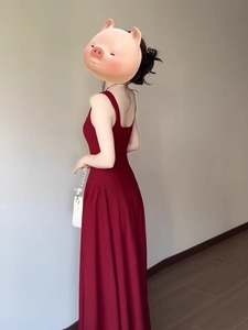 2025 新しいフレンチスタイルのハイエンドヘップバーンスタイルレッドサスペンダードレス女性の夏のウエスト A ラインロングスカート