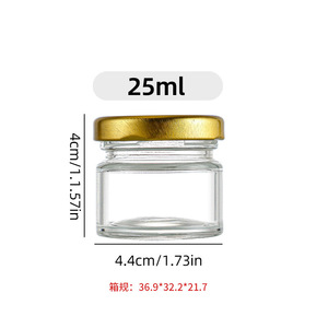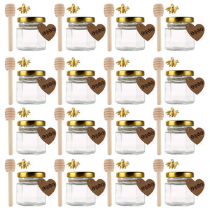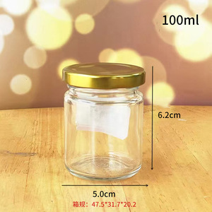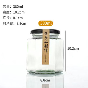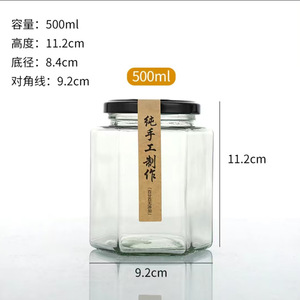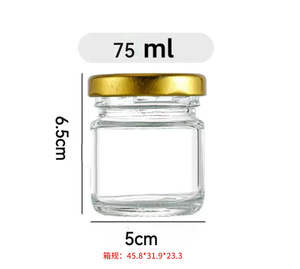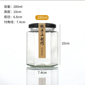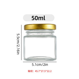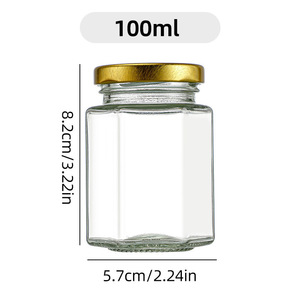 国境を越えた六角形の丸い空のボトル、ハニーハニージャムボトル、小さなボトル、蓋付きガラスボトル、透明な包装、密封ボトル