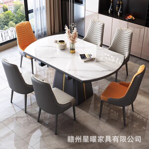 長さ118 * 幅76 * 高さ76 CM; スレート伸縮ダイニングテーブル+椅子6脚; ブラックベース; 雪山ホワイトスレートテーブルトップ