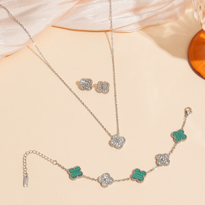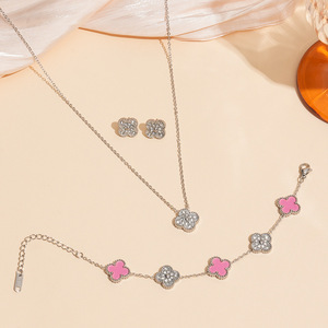 チタン鋼色褪せないダイヤモンド両面四つ葉フラワーセットネックレス、軽い高級感と高級感のある鎖骨チェーンブレスレットジュエリー