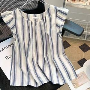 ストライプシャツレディース小飛袖夏新作シンプルデザインレトロシャツ年齢軽減カジュアルお腹カバートップス