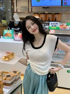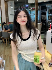 フレンチコントラストカラーUネックニット半袖Tシャツレディース夏デザインニッチシックショートスリムフィットショルダートップトレンディ